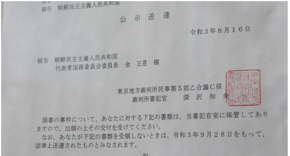 >「被告 朝鮮民主主義人民共和国代表者国務委員会委員長 金正恩様」